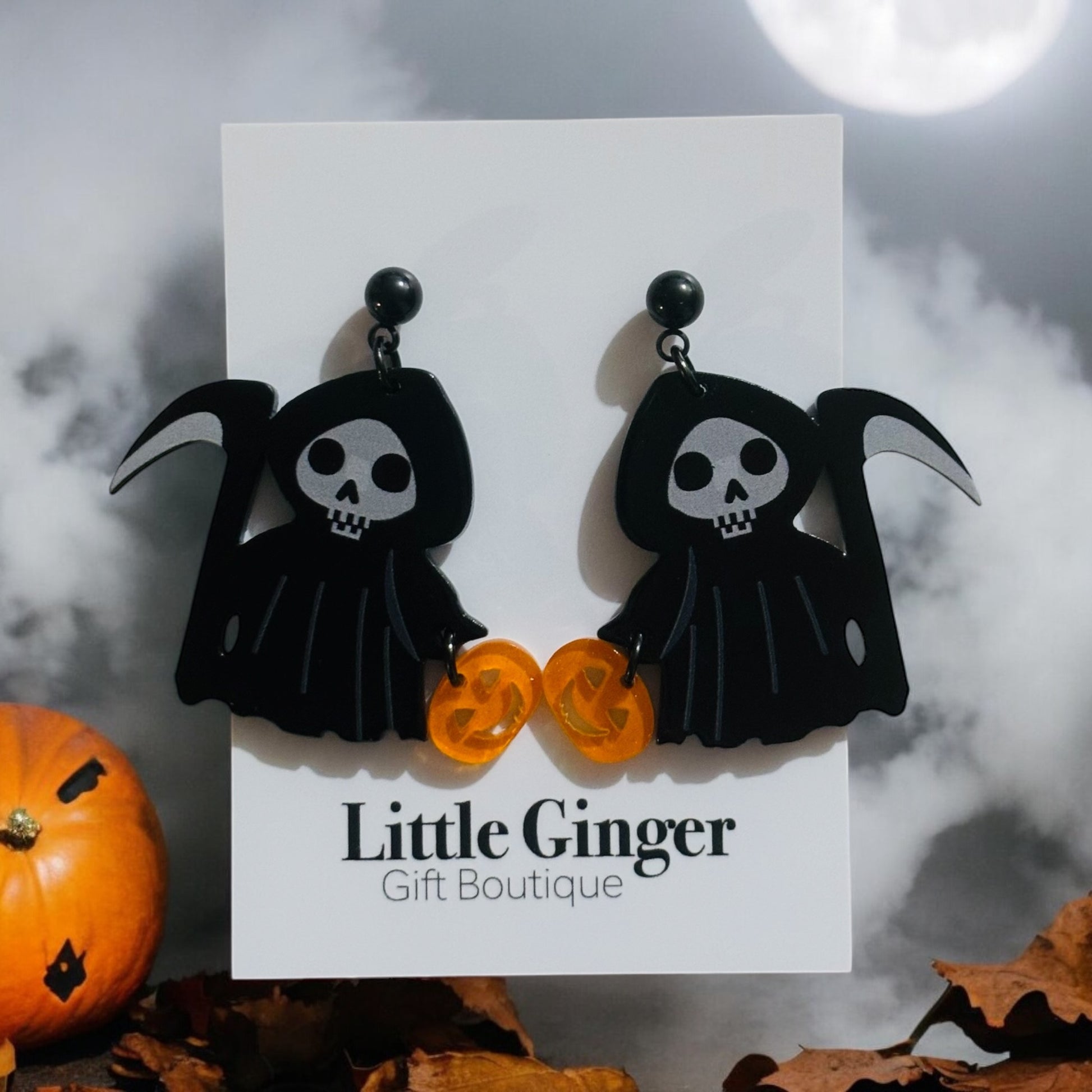 Transform your Halloween look with these Acrylic Grim Reaper earrings. These cute earrings showcase the fun side of the spooky season and will definitely make a statement. Perfect for any Halloween party or costume, these earrings add a touch of personality to any outfit.