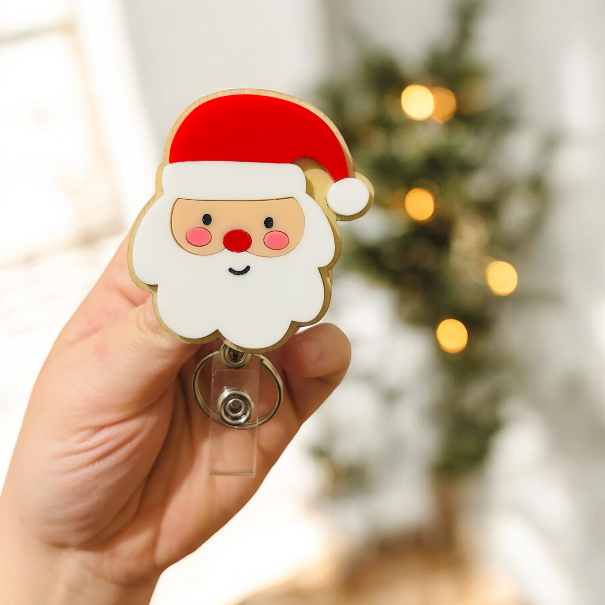 Christmas Santa Badge Reel- Acrylic + Birch Wood