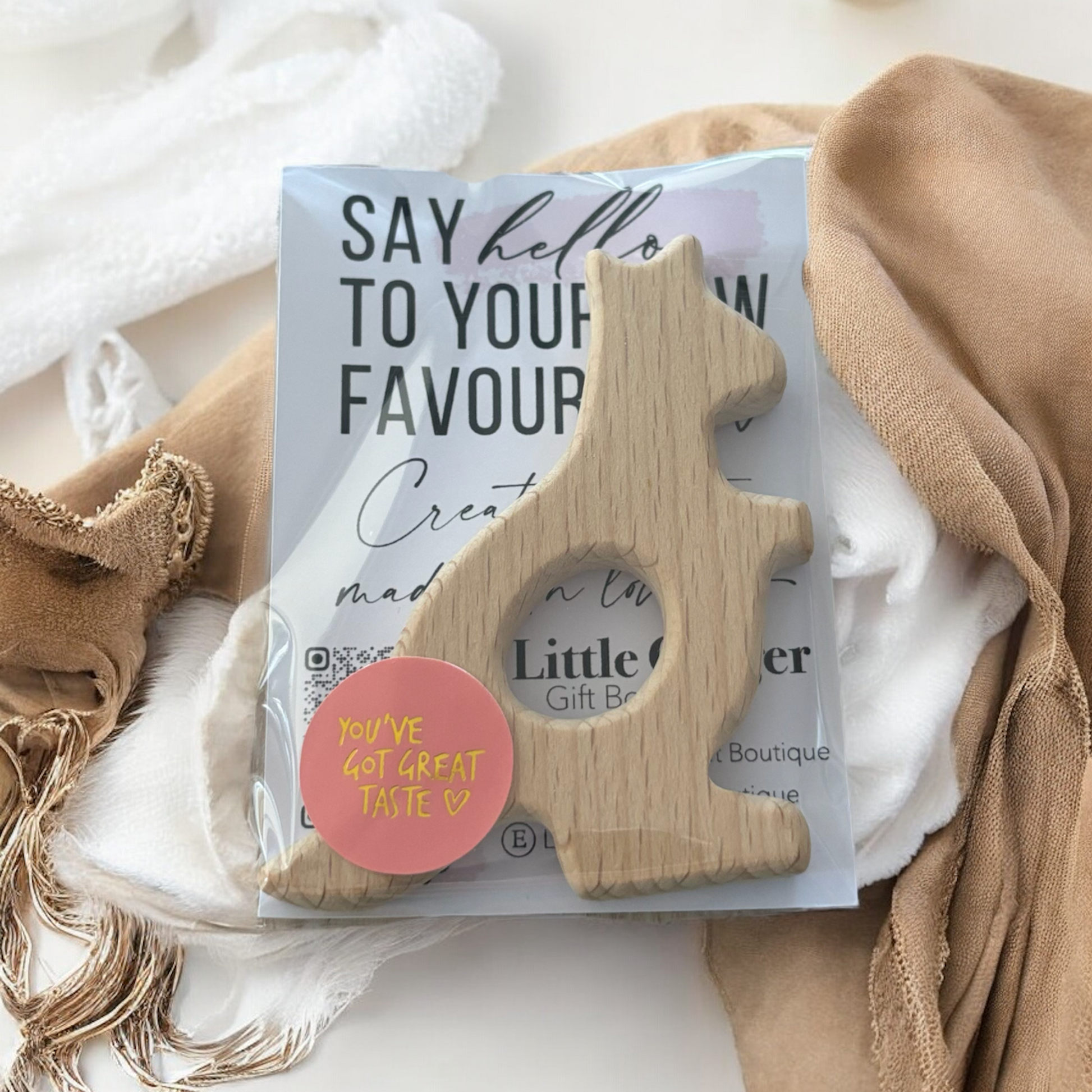 The Kangaroo Teether is made of natural birch wood, perfect for soothing teething pains. Its unique kangaroo shape adds a playful touch to the soothing experience. Help your little one find relief while promoting healthy oral development.