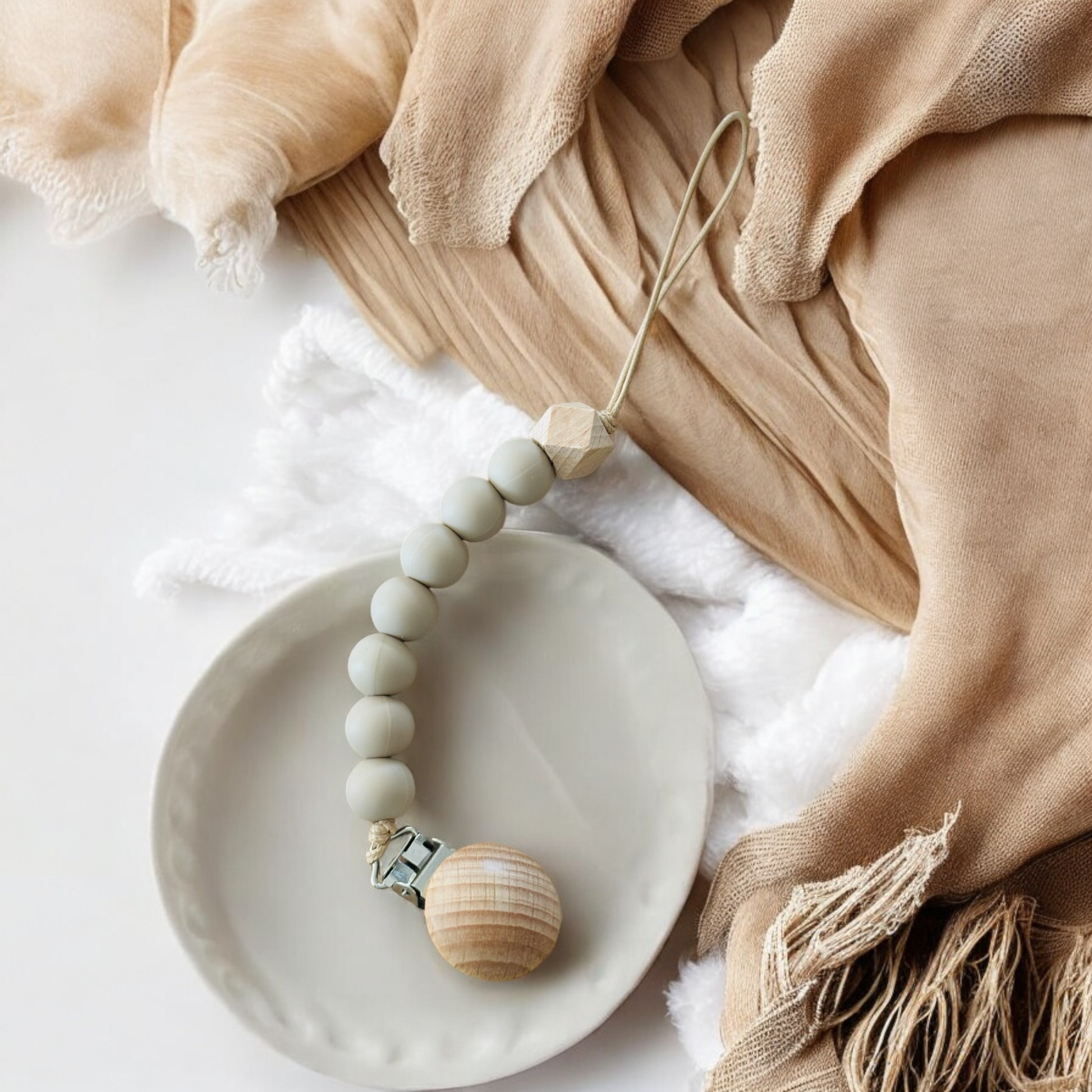 Add a touch of elegance to your baby's dummy with our Light Brown Silicone and Birch Wood Dummy Clip. Made with high-quality materials, this dummy clip is not only stylish but also safe for your little one. Say goodbye to lost or dirty dummies and hello to convenience and style!