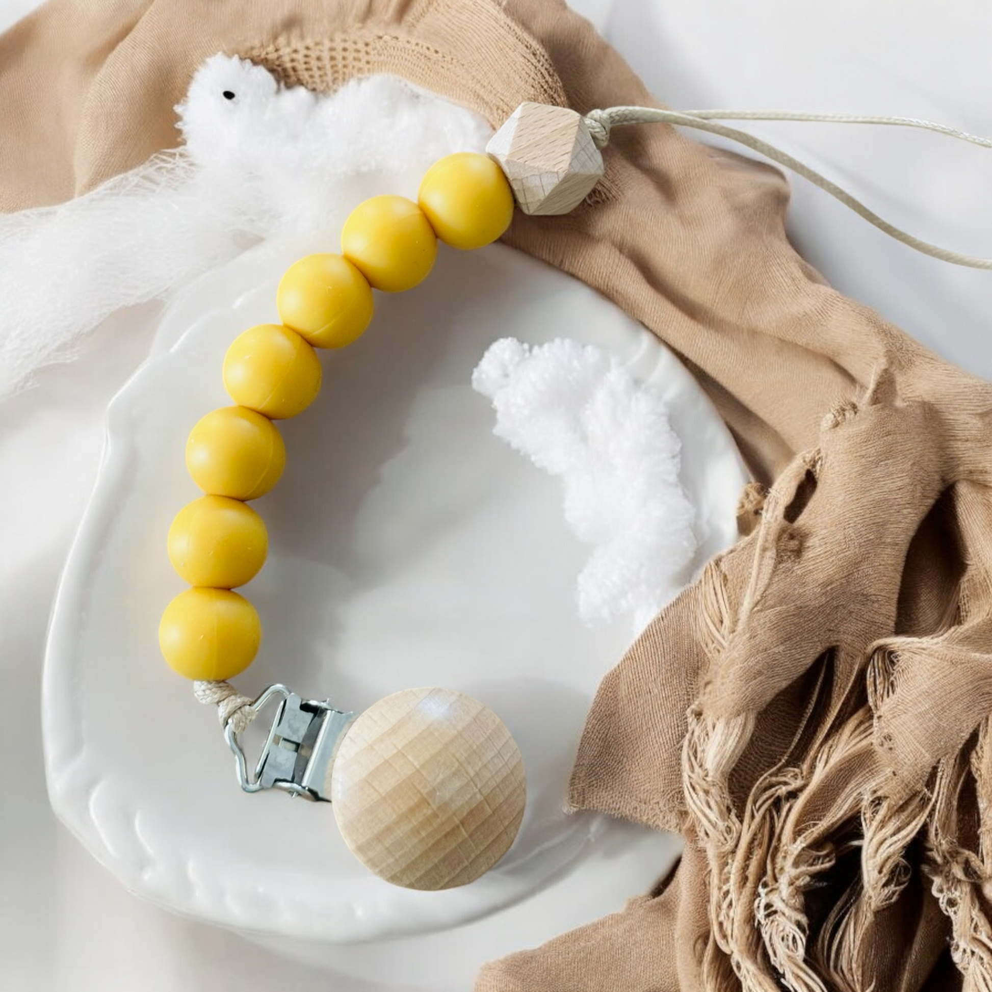 Add a touch of elegance to your baby's dummy with our Mustard Silicone and Birch Wood Dummy Clip. Made with high-quality materials, this dummy clip is not only stylish but also safe for your little one. Say goodbye to lost or dirty dummies and hello to convenience and style!
