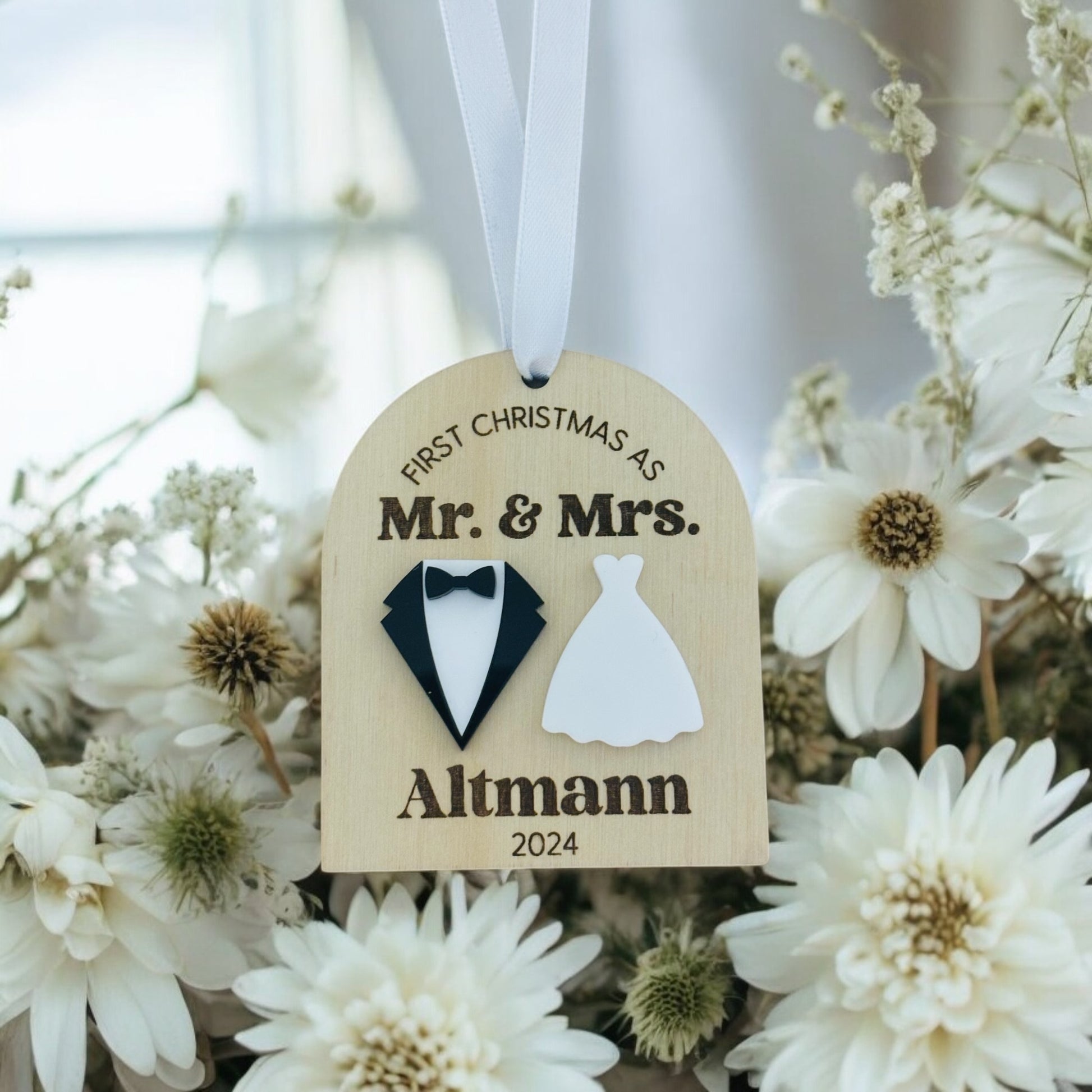 Celebrate your first Christmas as Mr. and Mrs. with our wooden ornament! Made to last, it will become a treasured keepsake for years to come. Hang it on your tree and remember the special memories made this holiday season. Order now and make your first Christmas as a married couple even more meaningful!