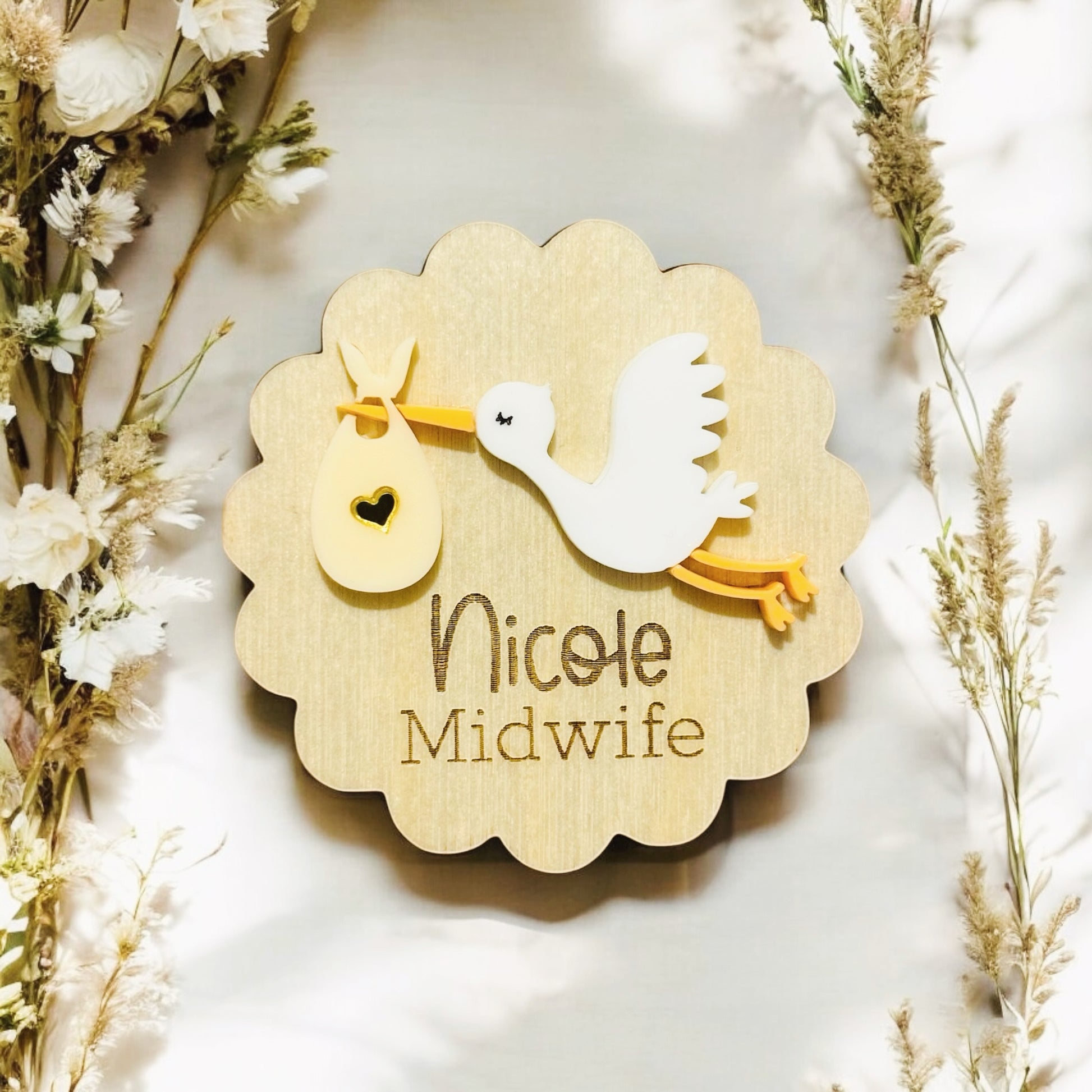 Introducing the Stork Name Badge - a cute and stylish accessory for Doulas, Students, Nurse’s and Midwives! Made with wood and acrylic, this badge will add a touch of charm to any uniform. Wear it proudly and let everyone know your name and profession.