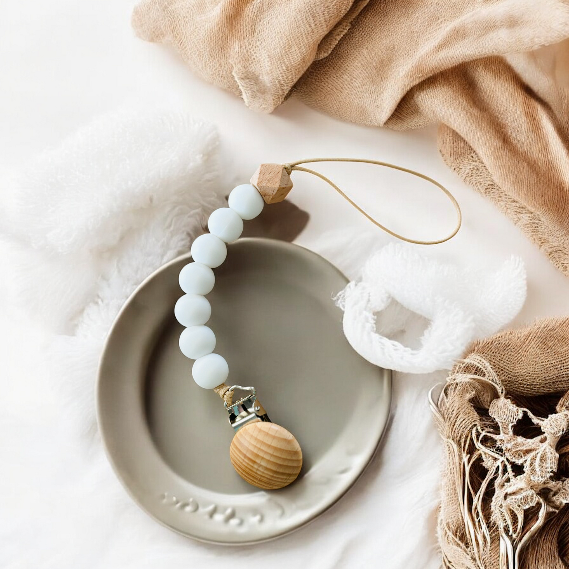 Add a touch of elegance to your baby's dummy with our White Silicone and Birch Wood Dummy Clip. Made with high-quality materials, this dummy clip is not only stylish but also safe for your little one. Say goodbye to lost or dirty dummies and hello to convenience and style!